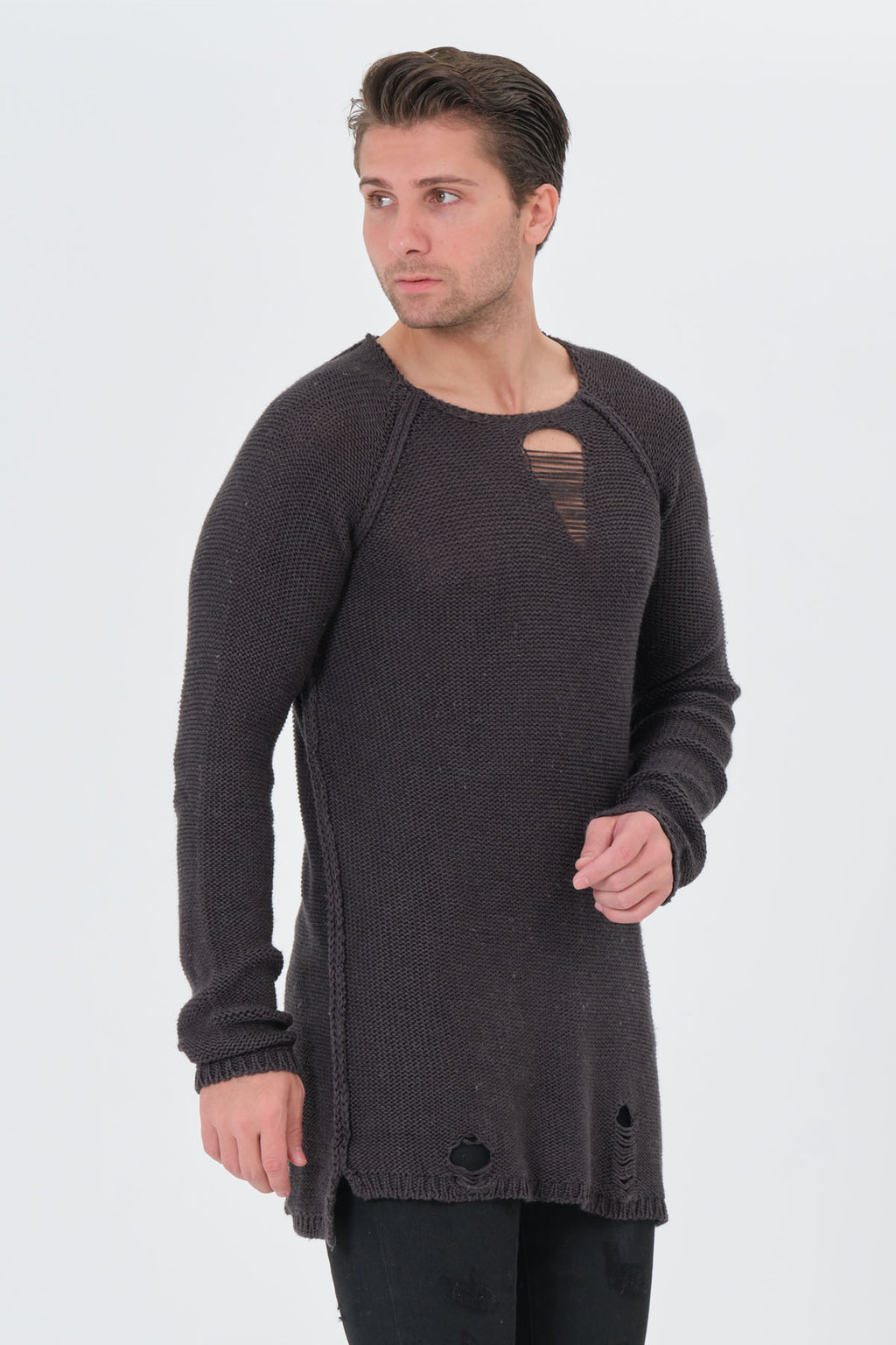 Defcon3 Collection's torn detailed sweater, comfort cut, long sleeves. Stylish cuts on the chest and backside skirt.