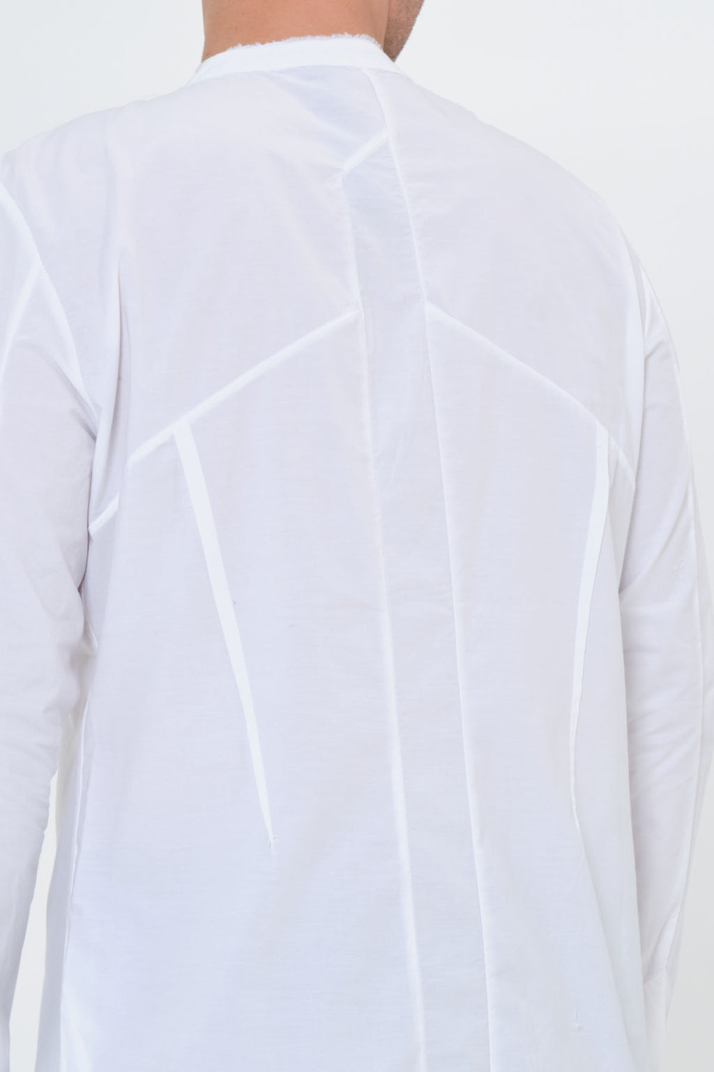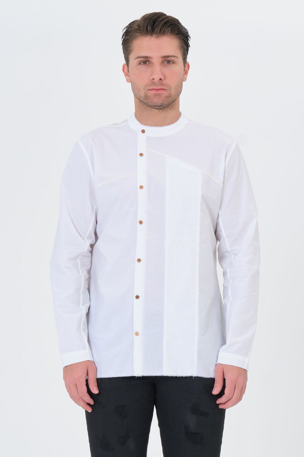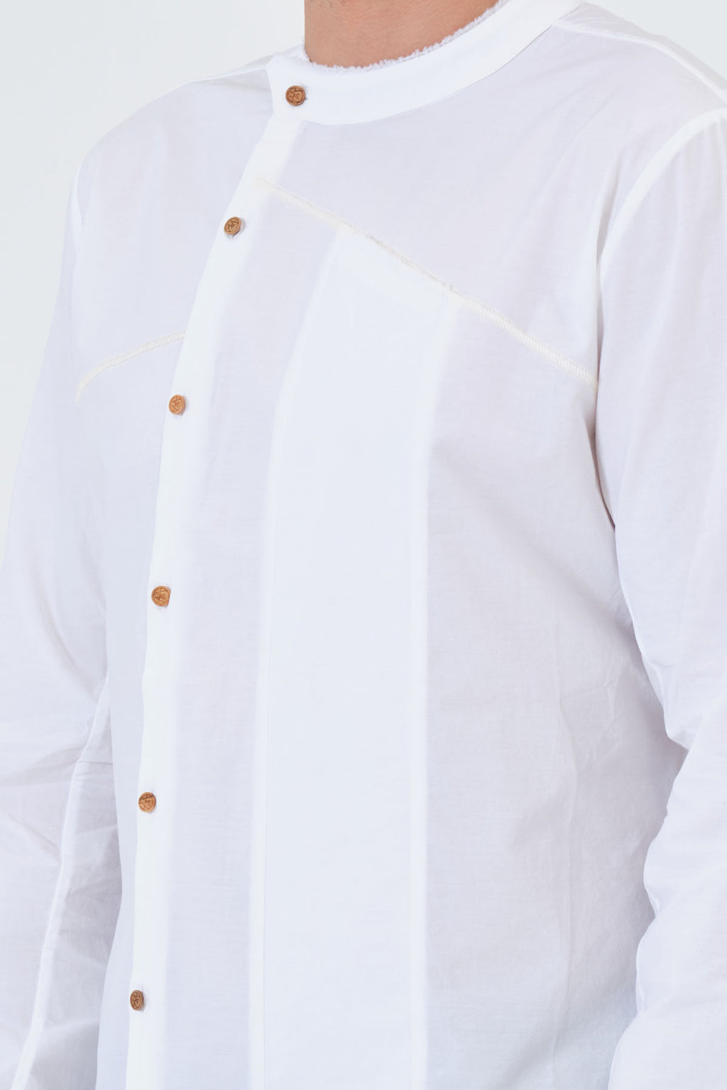 Color: White SKU: 20619001-2 Fit: Standard Collar: Mandarin Collar Style: Unclean-tipped Buttons: Olive Wood with Logo Closure: Asymmetric Pocket: Functional and Asymmetric on Left Chest Back Detail: Band