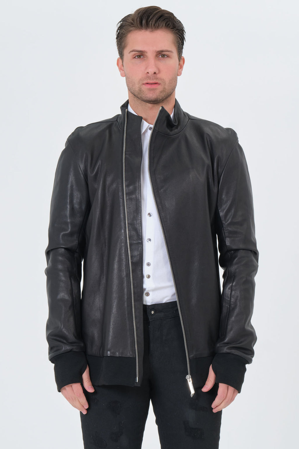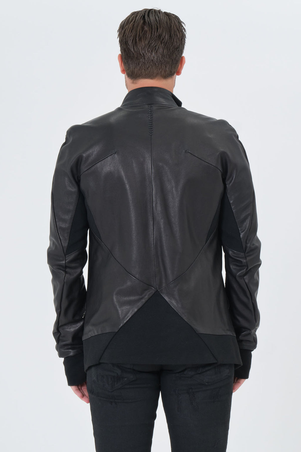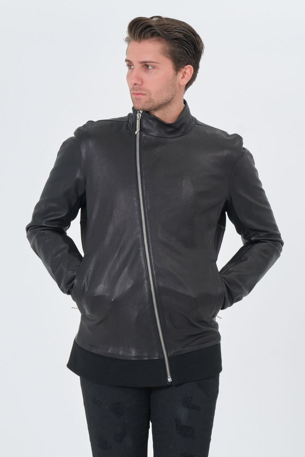 The Barbarossa Moratti 20719052-1 is crafted in genuine leather, featuring an asymmetrical (diagonal) zip closure and a structured stand collar. Ribbed cuffs and hem refine the fit, while the geometric back panel lines add a distinctive, modern finish. A bold, clean statement piece that elevates any black-on-black look.