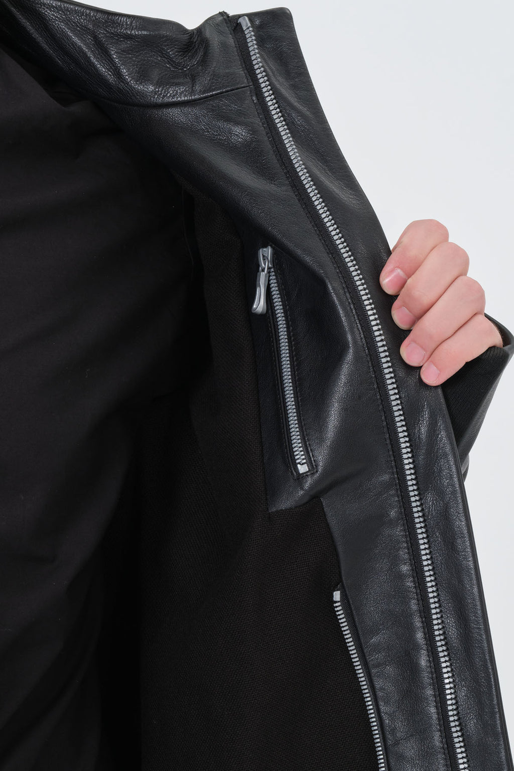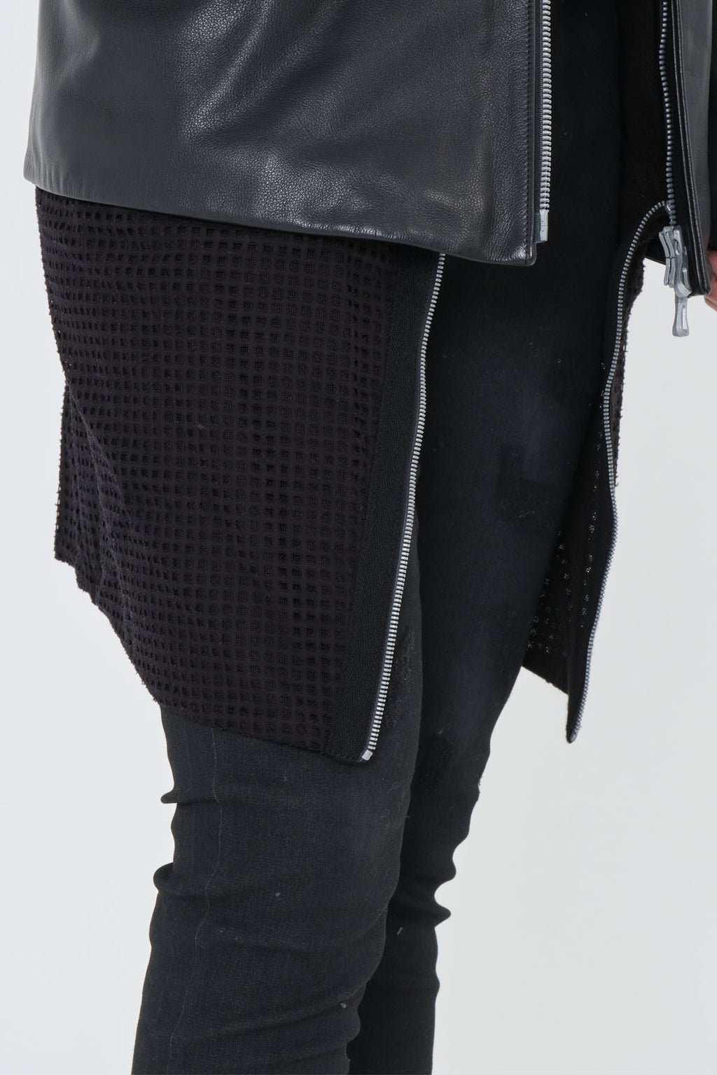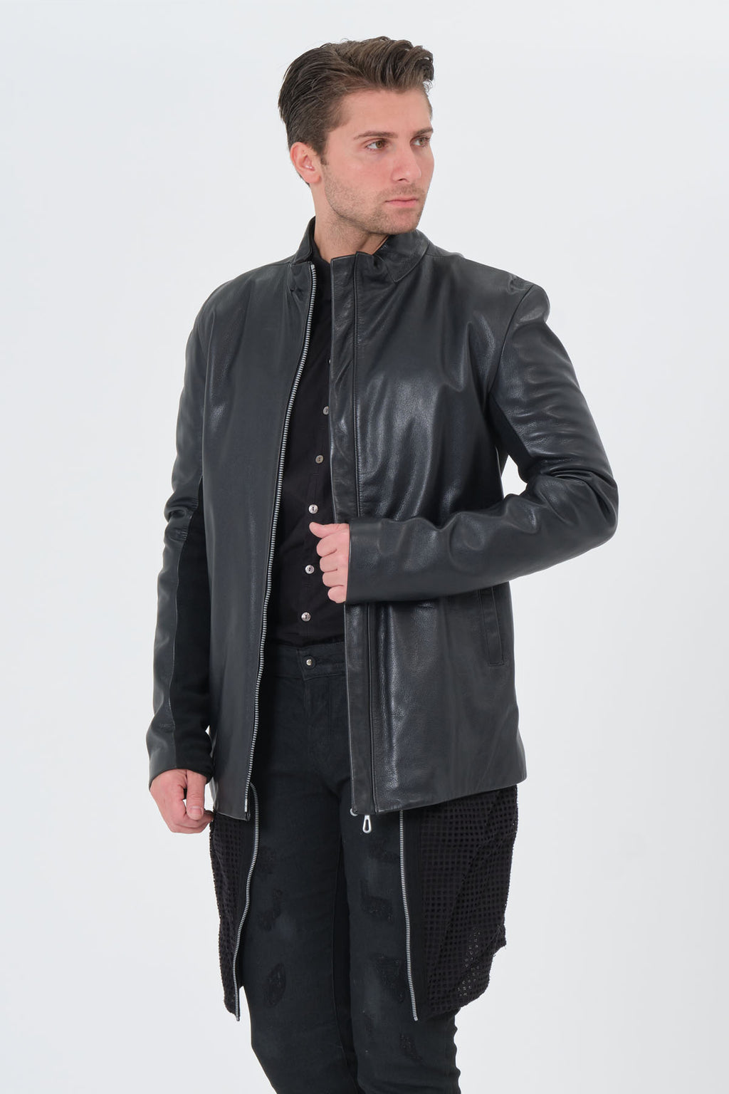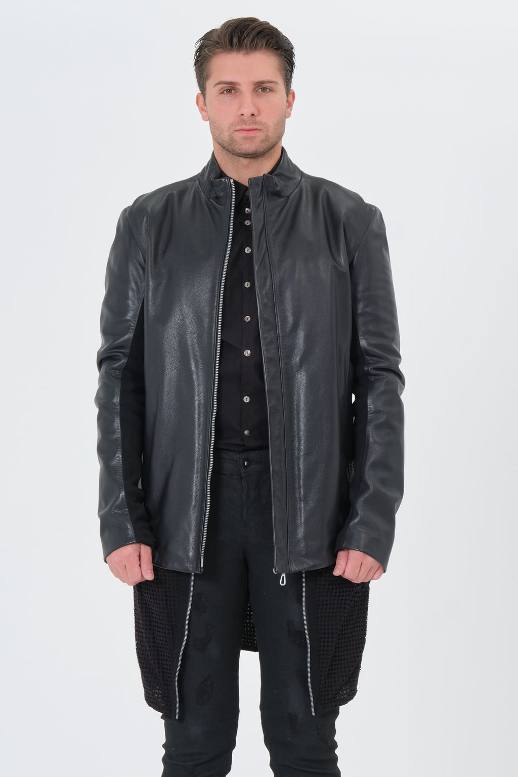 What sets it apart is the layered look visible at the lower section, adding depth and an elongated styling effect—breaking the “standard” leather jacket vibe and pushing it into modern avant-garde territory. Style it in all-black for maximum impact, or contrast it with technical layers and heavy footwear.