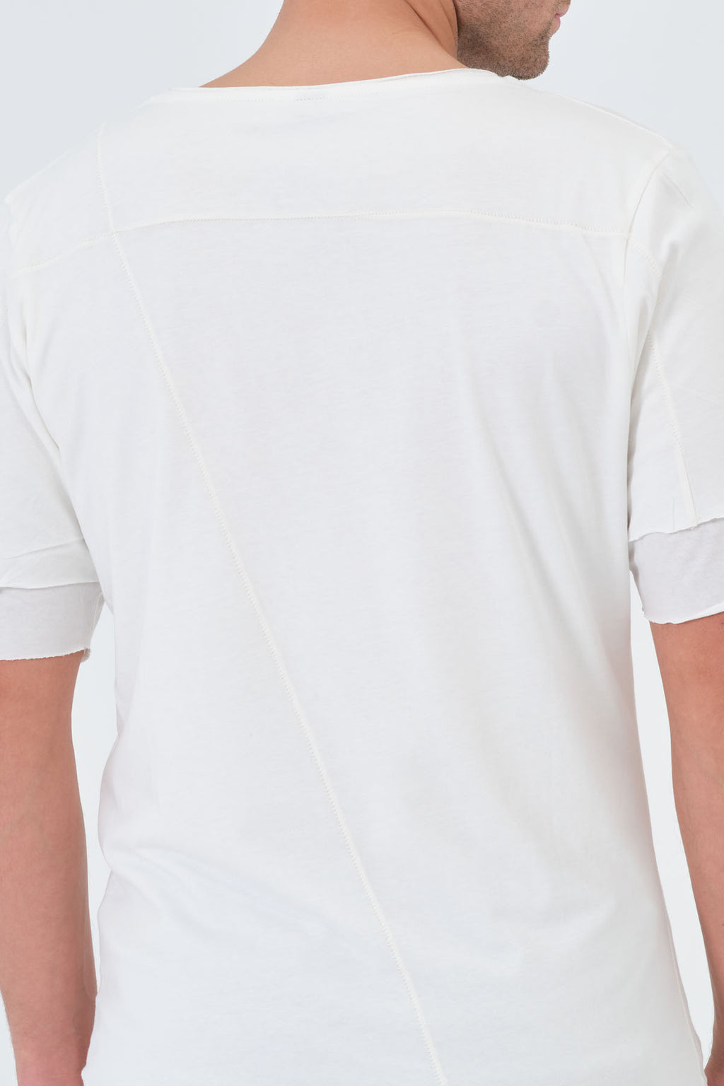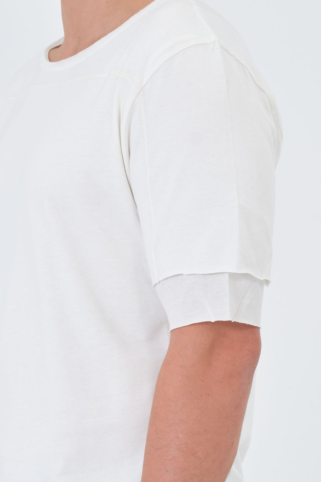 Discover the ultimate in style and comfort with the Barbarossa Moratti Defcon 3 Double Layered T-Shirt in Off White. This 100% cotton tee is designed for those who demand the best. The double-layered skirt and sleeves create a unique, fashion-forward look, while the large stitches and torn details add a touch of edginess.